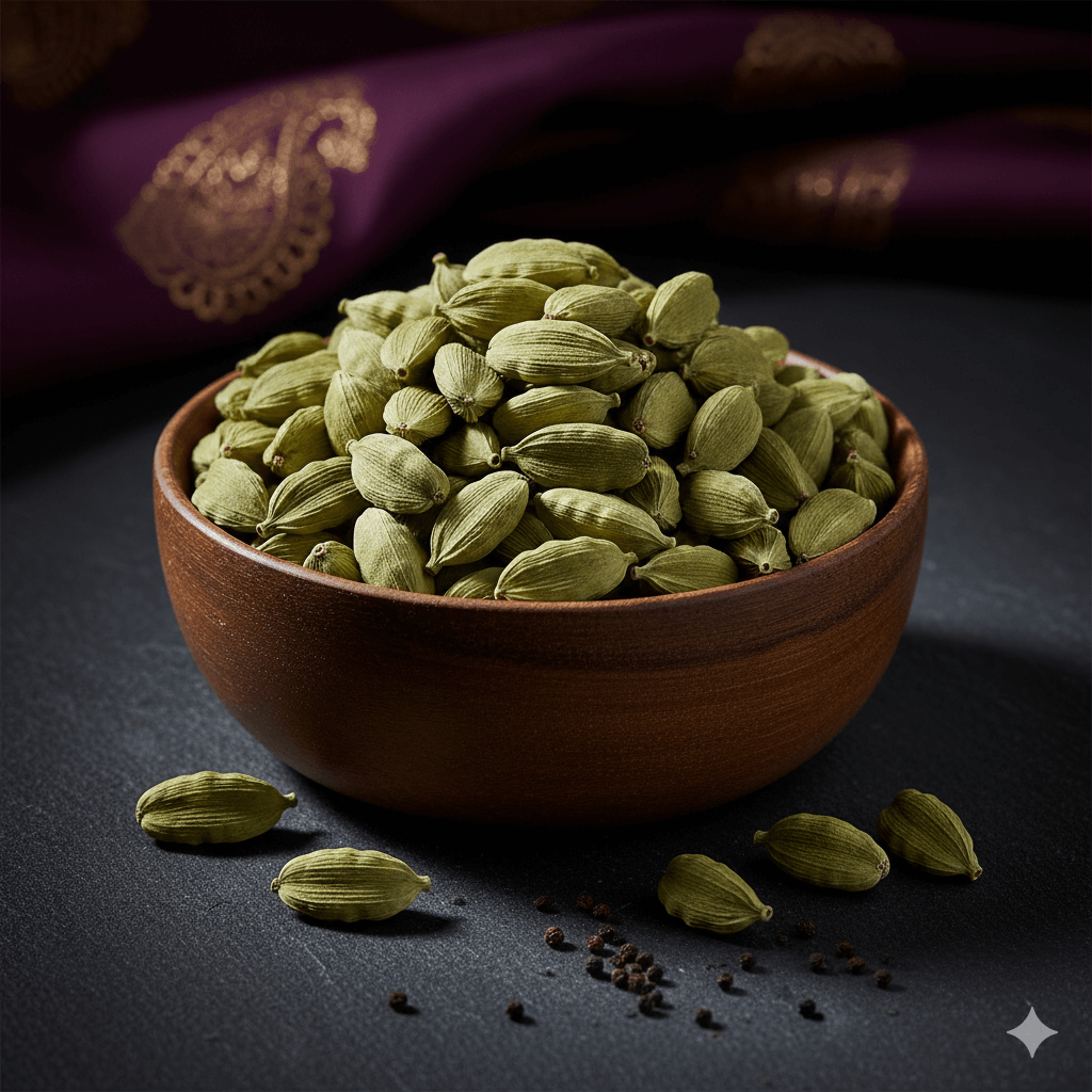 Alleppey Green Bold (AGEB). Sourced from Western Ghats with high volatile oil content and vibrant green color.